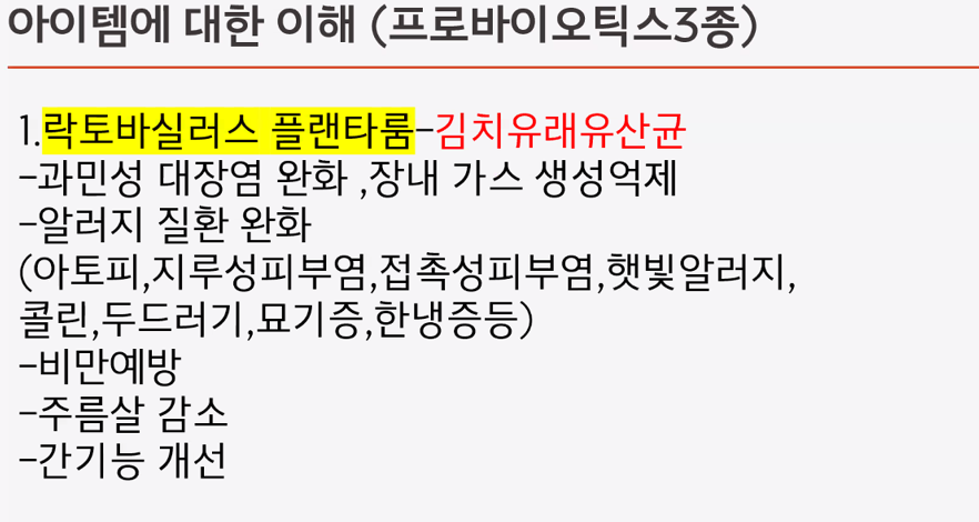 - 포스트바이오틱스 : 락토바실러스 플랜타룸이 식물성 유산균 균사체로서, 장내 유익균이 바로 안착하게 함